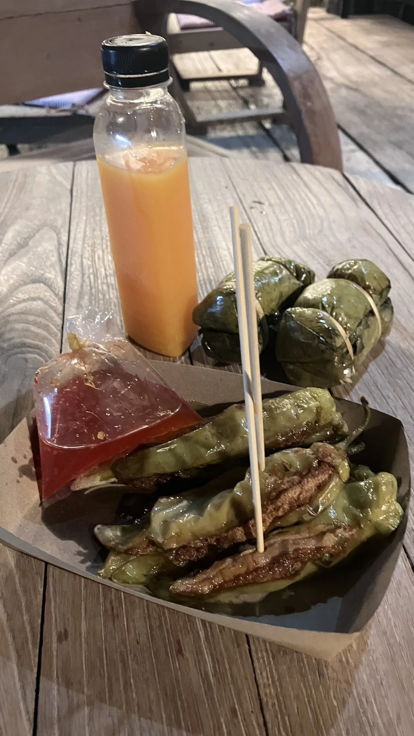 Of course, no trip to Ayutthaya is complete without experiencing the local cuisine, which sits somewhere between a culinary delight and a minor sensory assault, among the more deceptively polite offerings: Prik Yuak Sord Sai (พริกหยวกสอดไส้), Thai stuffed green chillies. These aren’t the fire-breathing dragons you might expect; Prik Yuak are mild, sweet green peppers, lovingly stuffed with minced pork or fish, then deep-fried or steamed to golden, guiltless perfection. (Pictured)
