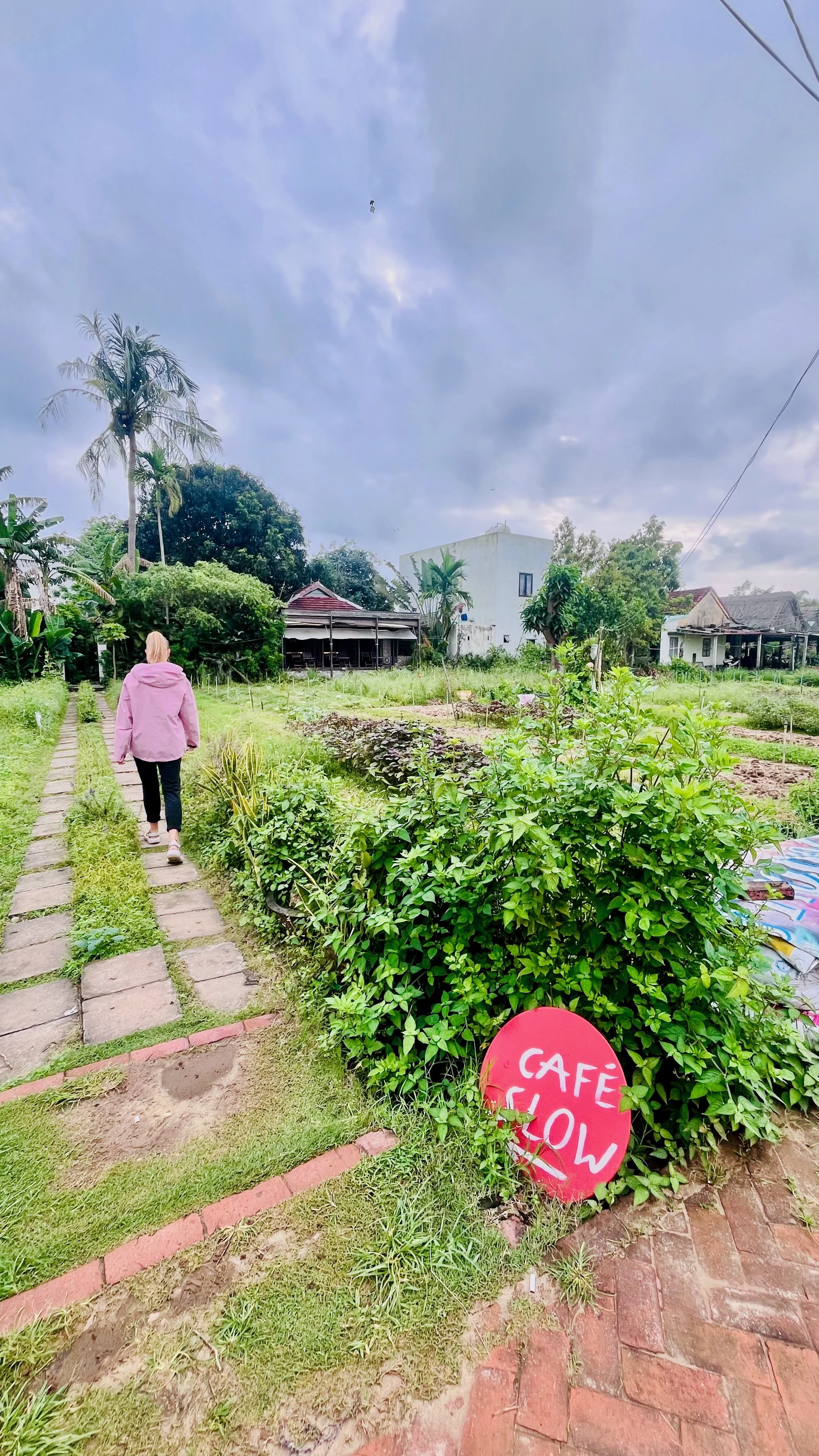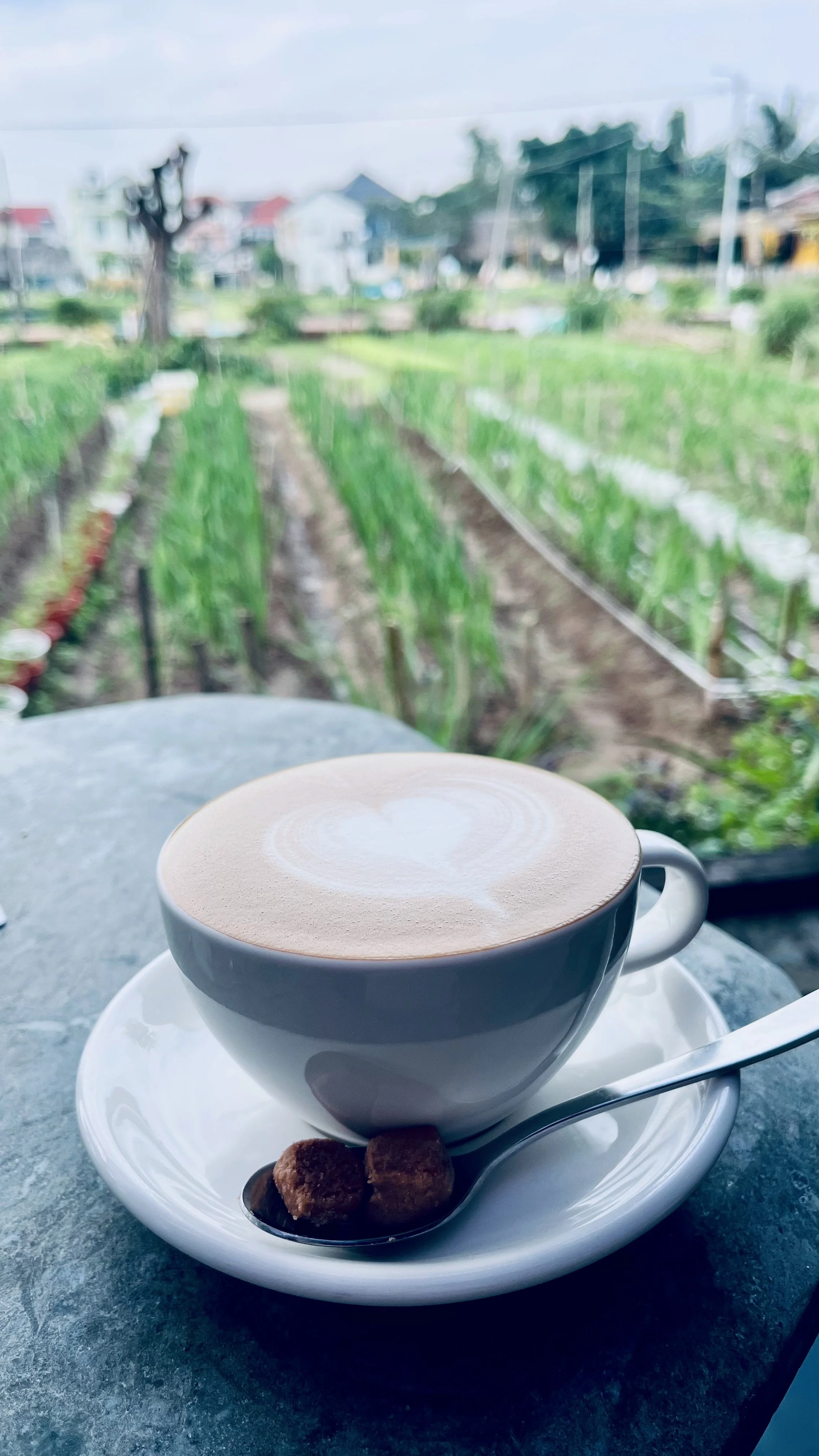 The setting is the other reason to make the trip. The café looks out over Tra Que vegetable village — neat rows of green stretching out in front of you, quiet and unhurried. It's the kind of view that makes it very easy to order a second coffee.