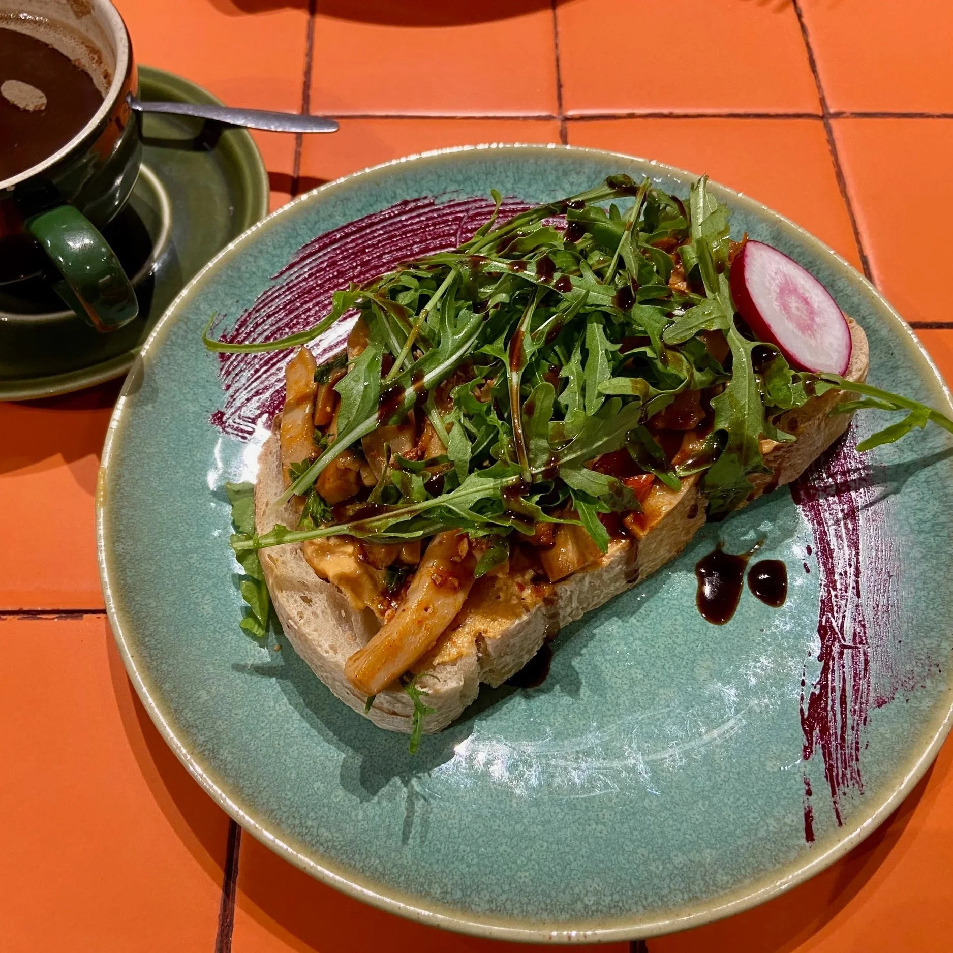 I had the vegan mushroom medley, and it was genuinely excellent. There's something about that fleshy, meaty texture of mushrooms that the West tends to overlook — here they're treated as the main event, served on a thick slice of grainy toast. Could have been toasted a touch longer, but that's a minor gripe. The espresso was great too.