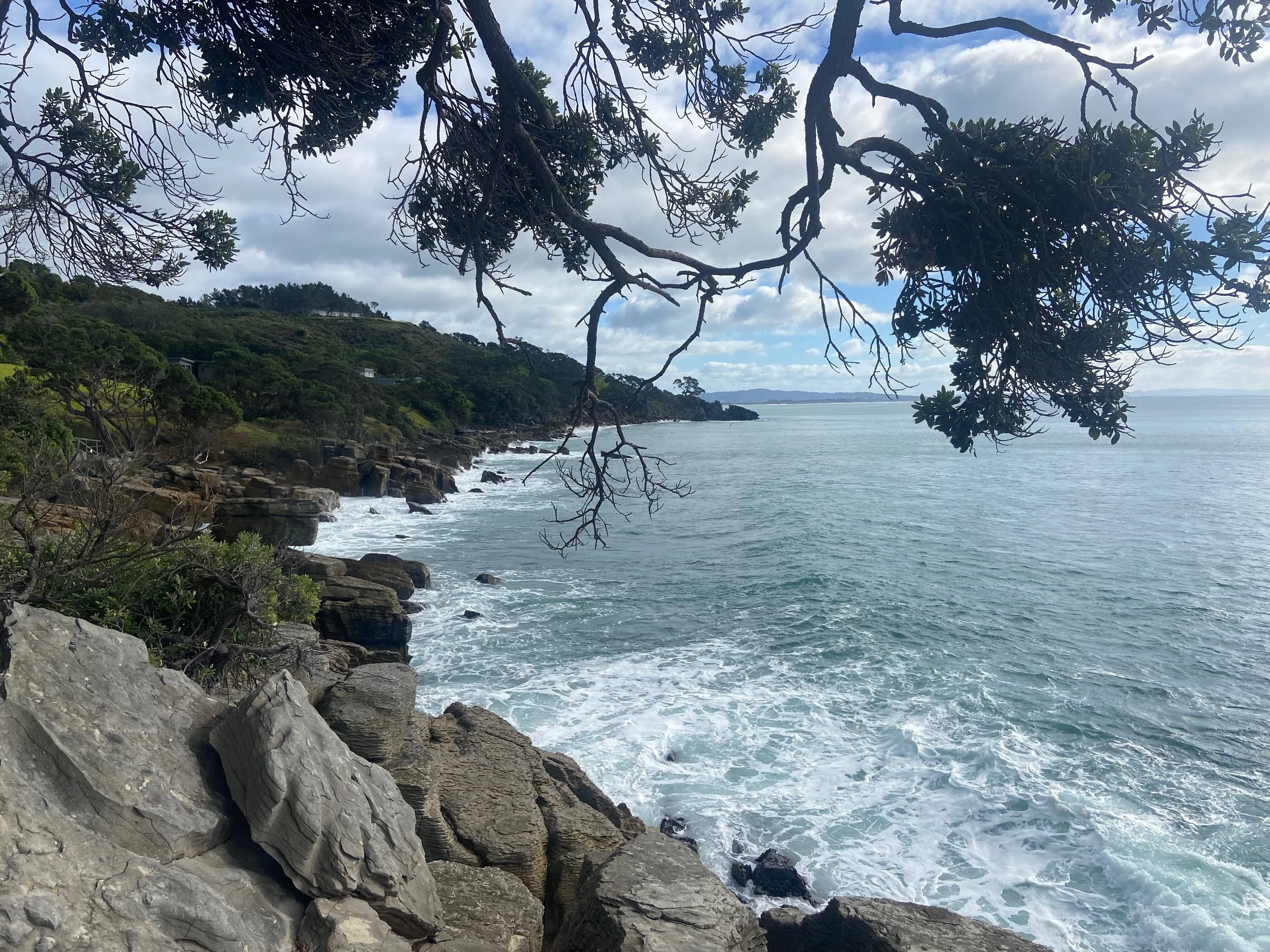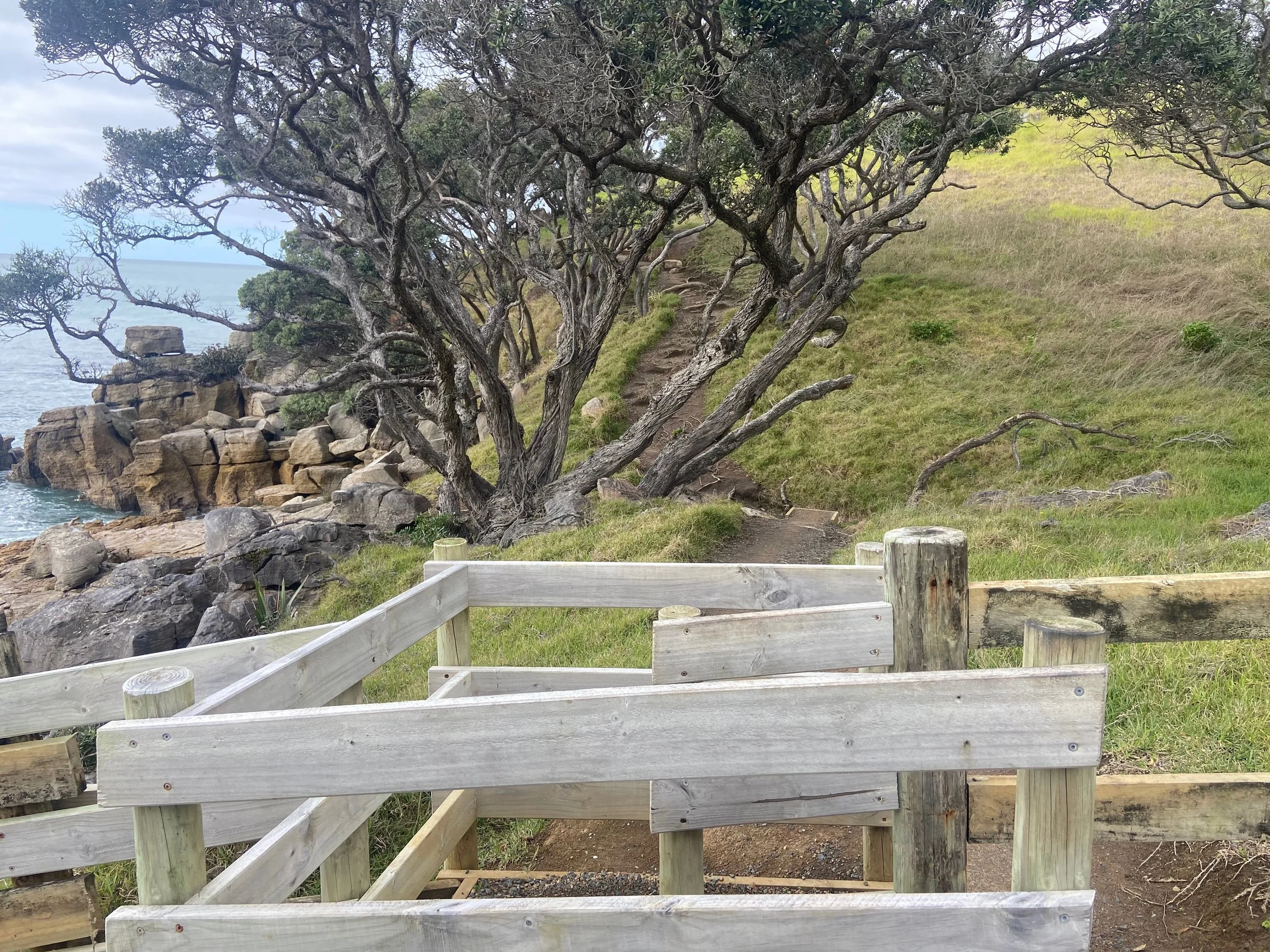 Being under the trees, this part of the track can sometimes be wet and muddy. There are a few steps throughout the whole track, and the wooden frames of these can be slippery. We managed just fine in sneakers, but my Mum was pleased to have a stick with her to provide additional balance. There are also a few large pohutakawa trunks that you need to climb over or under. Watch your head!